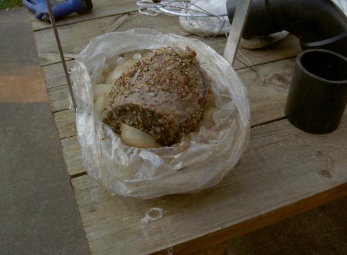Roast Beef and oven bag just removed from the inverted oven