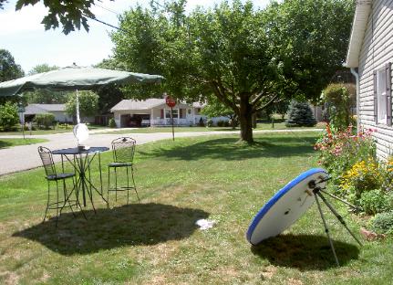 Typical Setup- Concentrating dish has a focal length of 8-10 feet, resulting in a hot spot of app. 1000F. The cooking surface is usually elevated